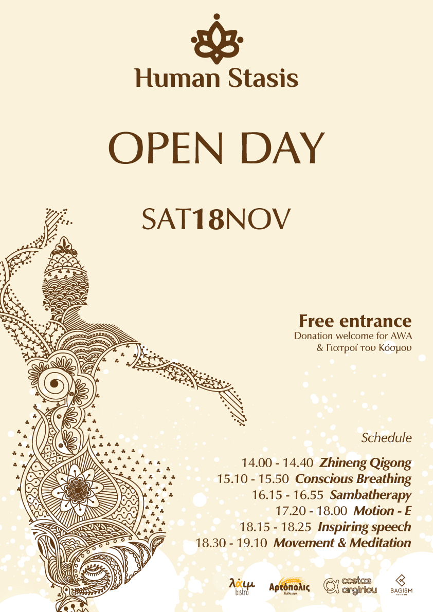 Dear friends, we invite you to spend a wonderful day filled with workshops and happy people. On this day the Human Stasis team will be there to share with you beautiful moments through our workshops. Please check out our schedule: 14.00-14.40 Zhineng Qigong -Chryssi Berou 15.10-15.50 Conscious Breathing - Monika 16.15-16.55 Sambatherapy - Cristina [...]